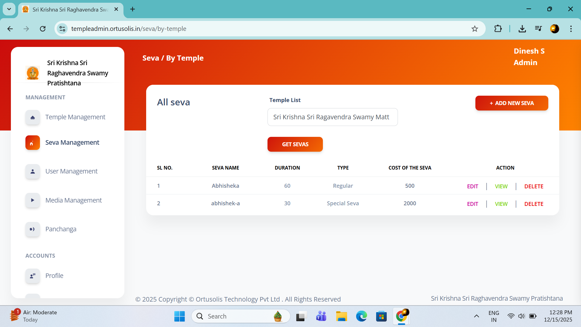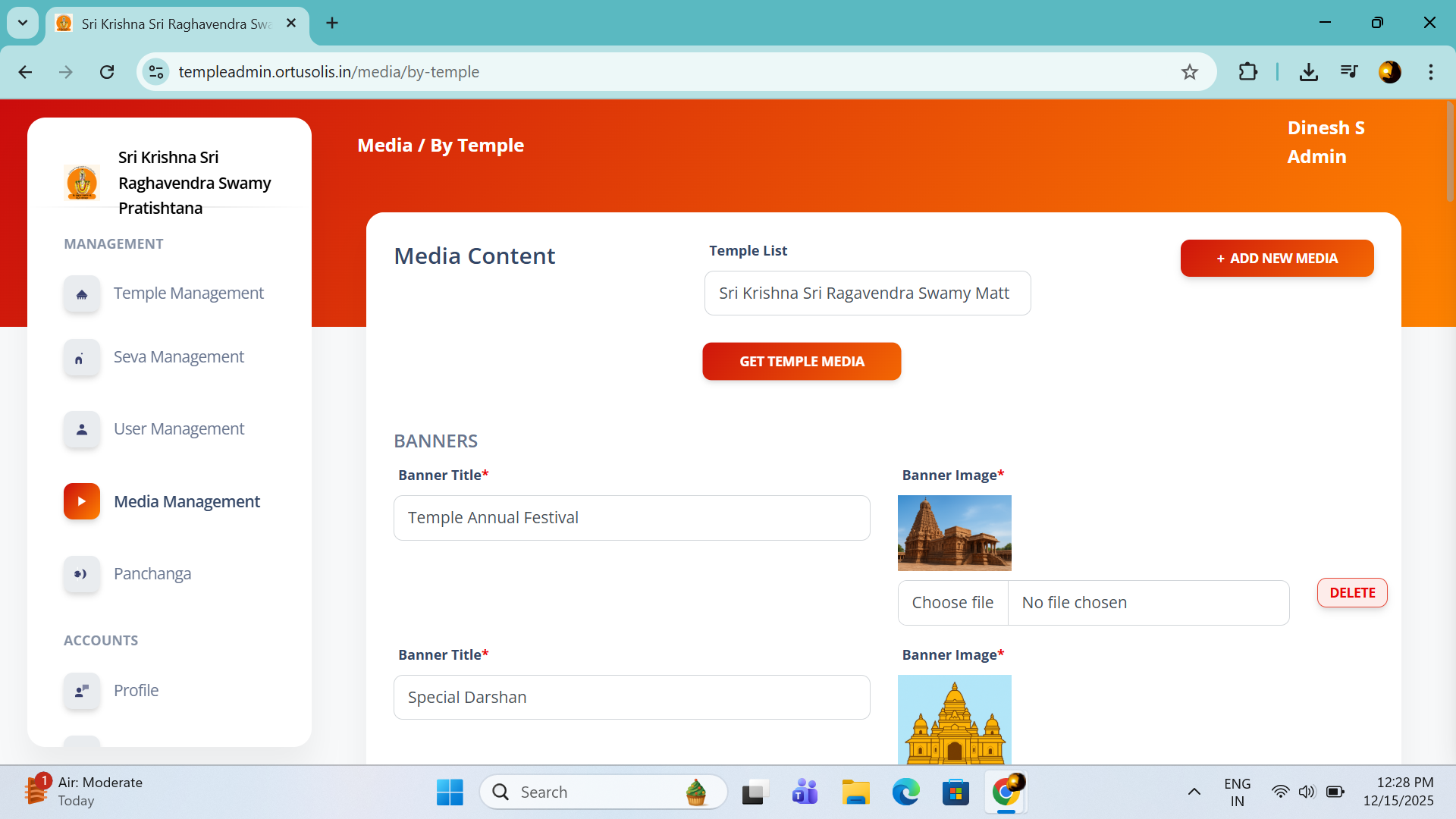 The Temple Management Application is a comprehensive digital solution designed to streamline temple administration and improve operational efficiency. It offers a secure, web-based admin panel that allows temple authorities to manage temple information, users, sevas, and Panchanga with ease. By digitizing key administrative processes, the system minimizes manual work, enhances transparency, and ensures accurate record management for temples of all sizes.